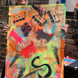 We explored the fantastic work of the anonymous street Artist Banksy. Experimenting with spray paint and stencils to create large-scale Art, inspired by Street Art and Graffiti!